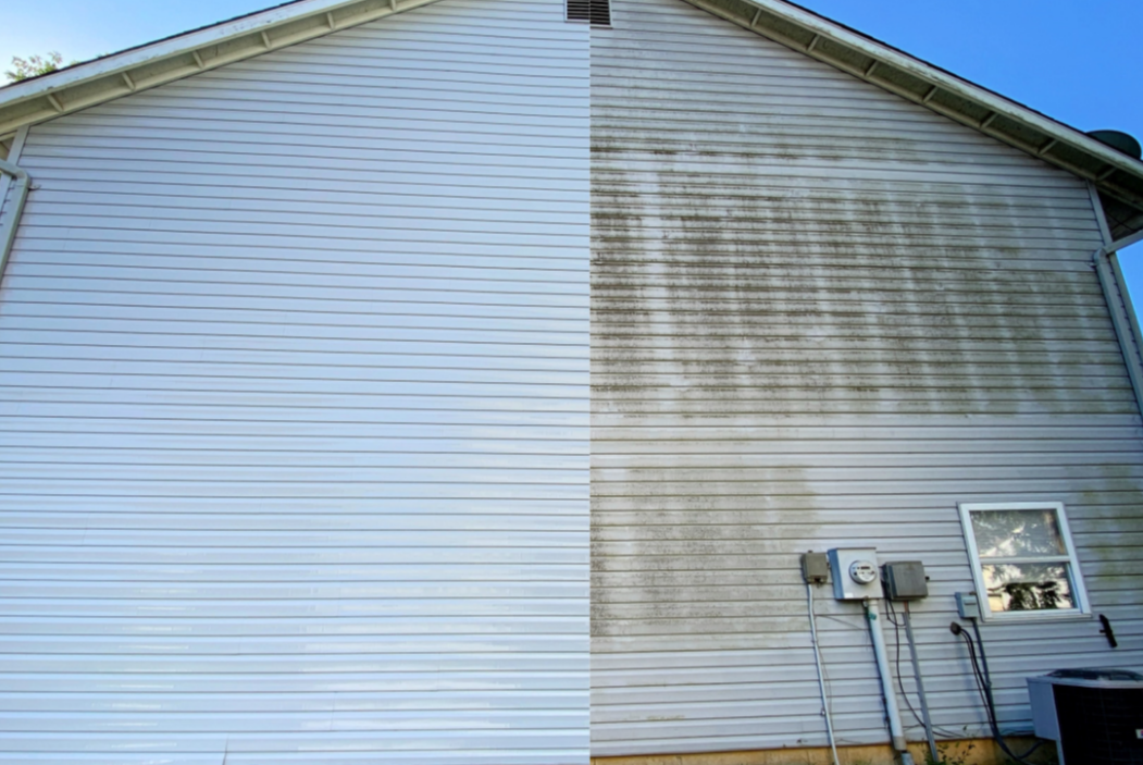 Remove dirt, algae, and mildew from siding and gutters.